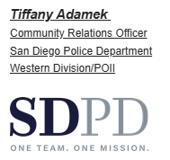 Representing your San Diego Police Department, Community Relations Officer Tiffany Adamek, Captain Matt Dobbs and two Lieutenants from Western Division will be present to chat. Think of this as the perfect chance to ask those burning questions or share your concerns over a cup of joe.